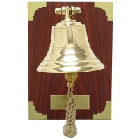 En ce qui concerne ce cadeau exceptionnel, la cloche en laiton pesant 700 ou bien 940 g est montée sur une plaque en bois foncé, dont les bouts sont aussi bordés de laiton. Le corps de la cloche - dont le diamètre fait 10 ou bien 12,5 cm - est monté avec deux visses sur le support galbé, le fixant ainsi à la plaque en bois. Cette composition magnifique est complétée par un morceau de corde en chanvre tressé, qui permet de faire sonner la cloche d'un son clair.